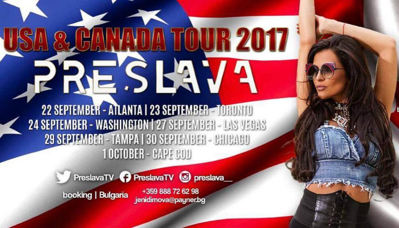 Овој месец Преслава ќе ги израдува своите фанови во Америка и Канада, кои за втор пат ја очекуваат со големо нетрпение. Почетокот е на 22 септември во Атланта, а следниот ден пејачката ќе ужива со своите фанови во Торонто, Канада во салата Milan Banquet Hall, каде што покрај нејзините најголеми хитови, таа ќе ги израдува присутните и со неколку народни мелодии.